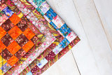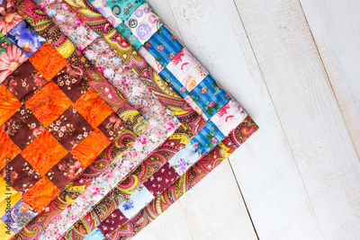 creation, style, comfort concept. original high-coloured hand made pattern performed from various colored fabric pieces decorated with exquisite and bizarre ornament