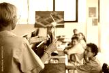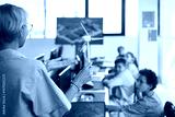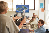 Caucasian middle aged woman holding wind turbine model while explaining renewable energy concept to group of diverse teenagers sitting at desks in computer classroom