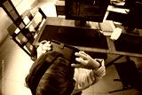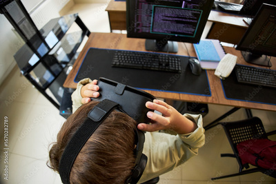 Teenager Caucasian boy wearing virtual reality headset sitting at desk in computer lab interacting with technology, computer monitors displaying code in background