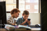 Two boys sitting together using smartphone, Caucasian boy holding device while multiethnic boy watching screen, both appearing as children focused on technology indoors
