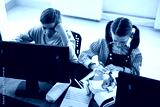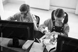 Caucasian boy and Caucasian girl child sitting at desk using computer and writing in notebook, focusing on schoolwork with books and orthopedic neck brace visible on table