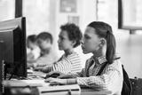 Caucasian girl child sitting at desk using desktop computer in classroom, focusing on screen while other children working in background, participating in educational activity