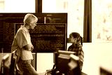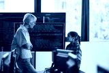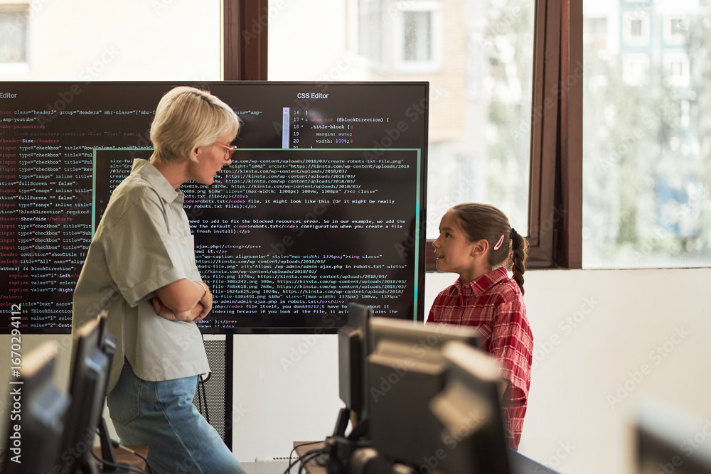 Middle aged Caucasian woman standing and talking with preteen girl in computer classroom, large monitor displaying programming code in background, both engaging in discussion
