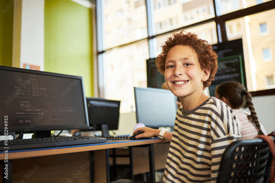 Portrait of Caucasian boy smiling while sitting at desk using computer in classroom, coding on monitor visible, other children working in background, modern educational setting