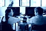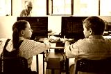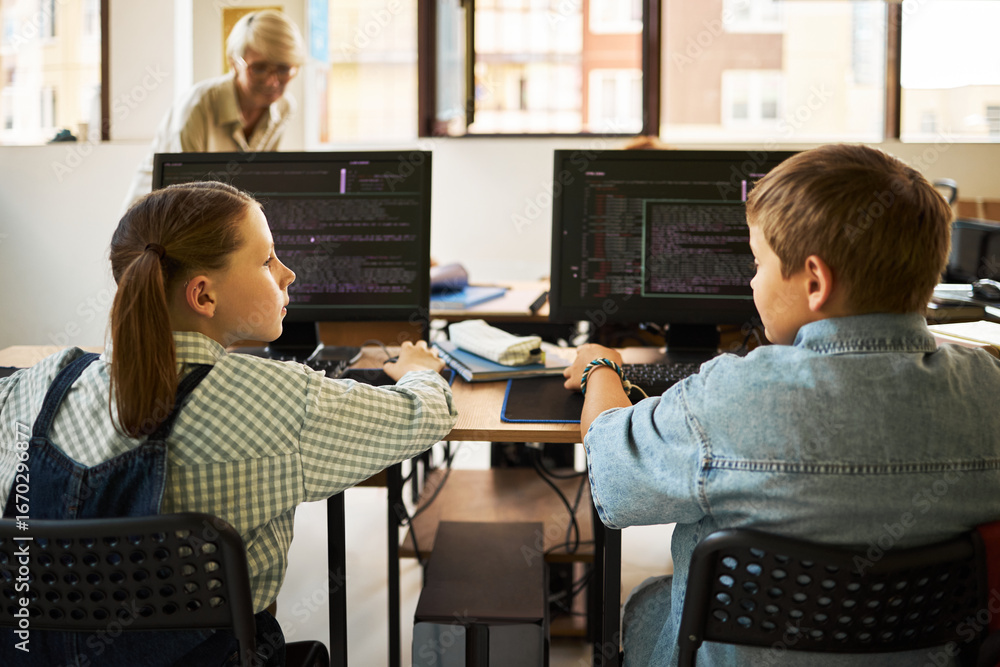Caucasian girl and Caucasian boy sitting at desk using desktop computers with code on screens in classroom, teacher standing in background observing students working on programming tasks