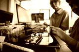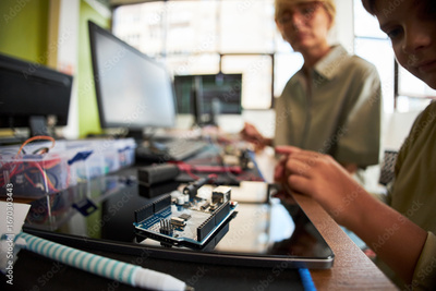 Caucasian middle aged woman and Caucasian child assembling electronic components on desk with microcontroller board, working together on technology project in modern workspace