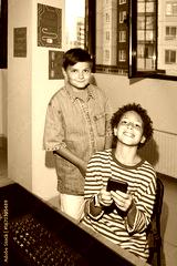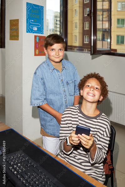 Two boys, one Caucasian and one Black, smiling in modern classroom, standing and sitting at desk with computer keyboard and holding smartphone, coding posters on wall, city buildings outside window