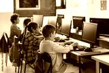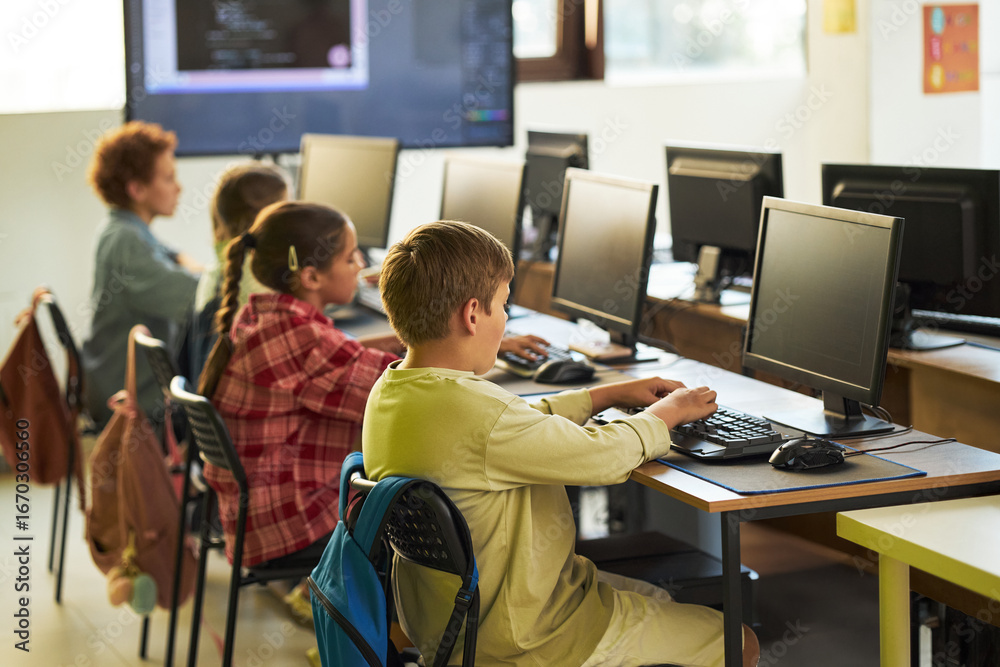 Group of Caucasian and Hispanic children sitting at desks using desktop computers in classroom, focusing on typing and learning technology skills during school lesson