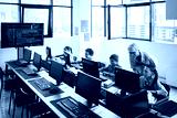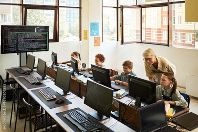 Caucasian female teacher assisting group of children using desktop computers in classroom, children sitting at desks working on coding tasks, large monitor displaying programming code