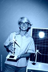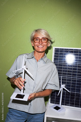 Portrait of middle aged Caucasian woman smiling while holding wind turbine model, standing next to solar panel and another wind turbine model against green background