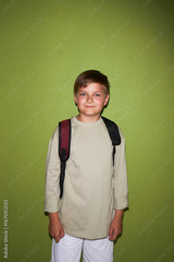 Portrait of Caucasian boy child standing against green background wearing backpack, smiling and looking directly at camera, showing confident and cheerful facial expression