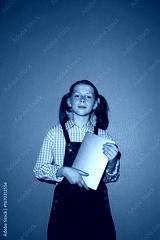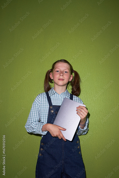 Portrait of Caucasian girl child standing against green wall holding digital tablet with confident expression, wearing hair in pigtails, looking directly at camera