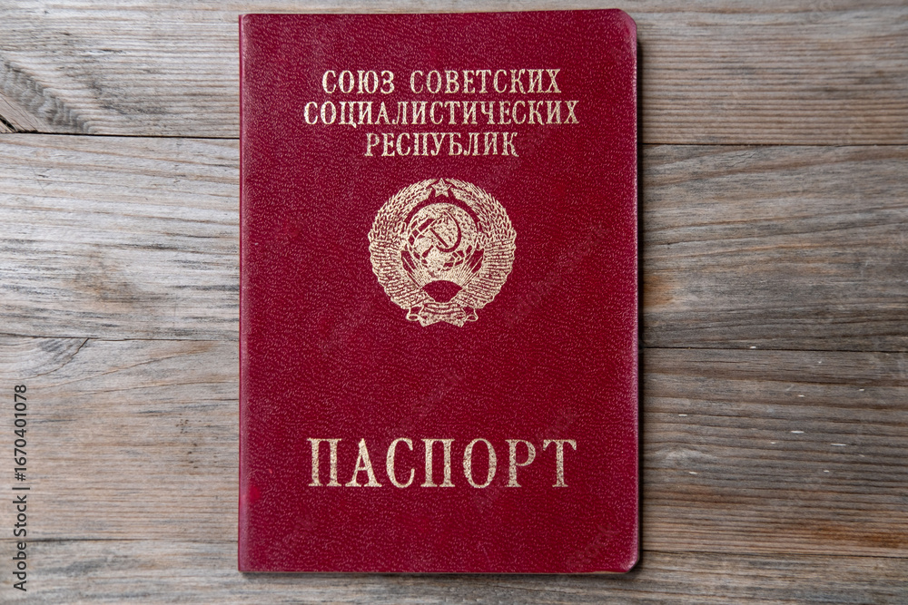 red USSR passport, Soviet emblem, historical document vintage red cover Union Soviet Socialist Republics passport, Historical document from Soviet era, political system communism
