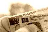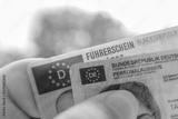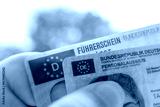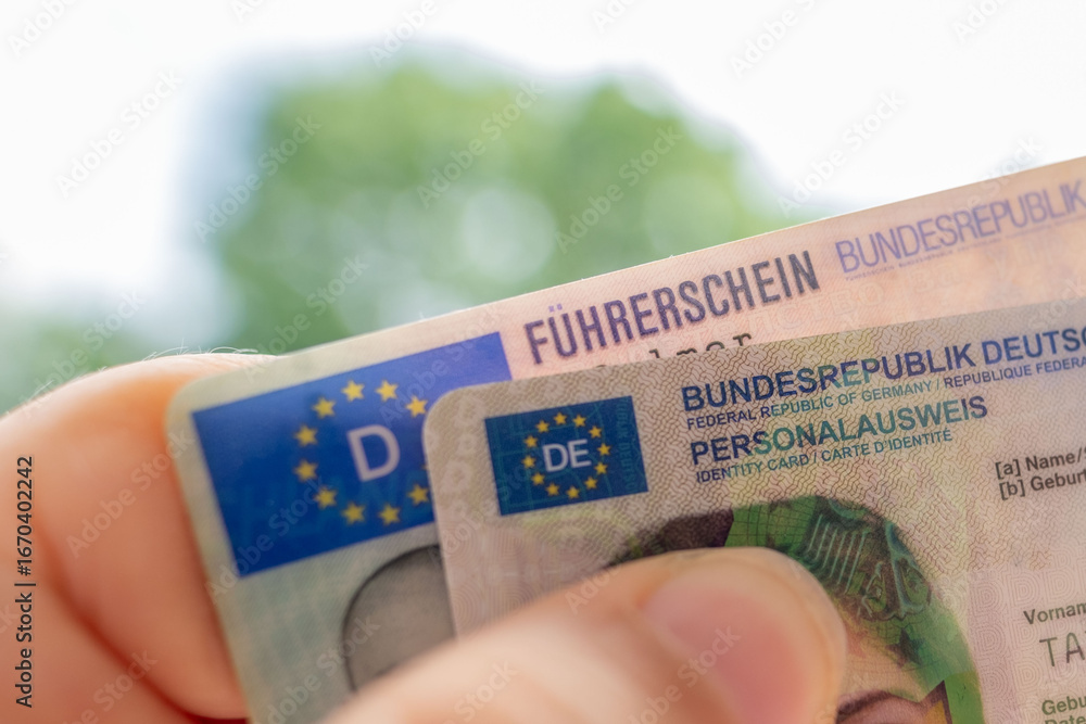 German ID card and driver’s license in hand, EU flag, Modern European driving permit, identification and travel, personal card and license, EU citizen travel, mobility documents