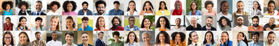A vibrant collection of portraits features diverse individuals sharing joyful expressions.
