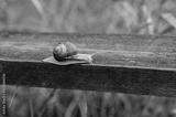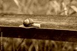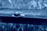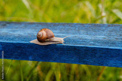Close-up of a brown snail crawling on a blue wooden railing, captured in soft morning light with natural green background