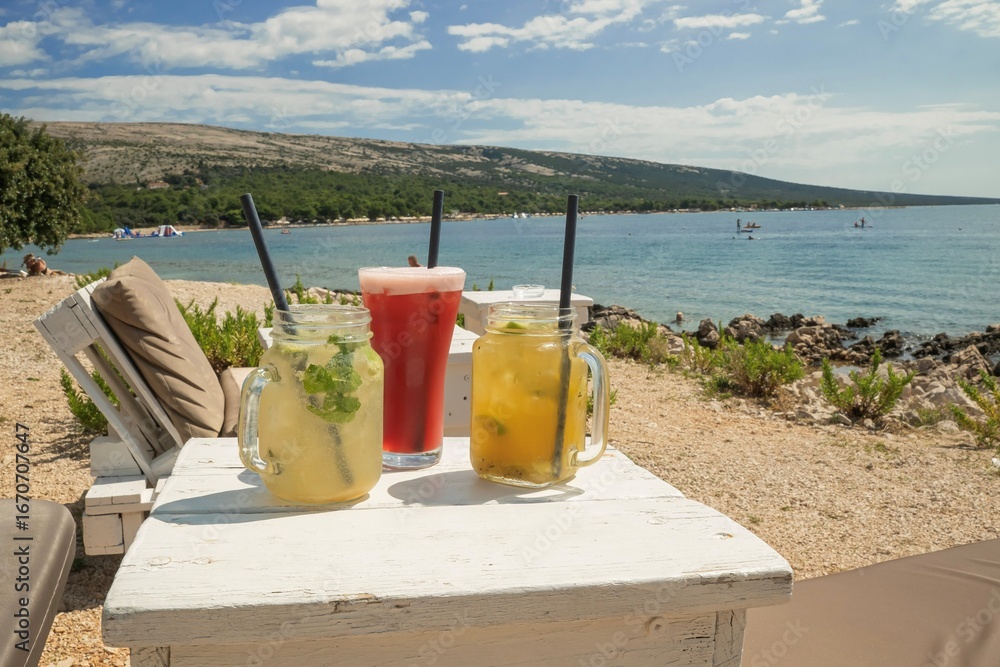 kolorowe napoje w szklanych kuflach na tle morza w słoneczny dzień