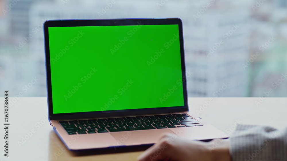 Finger tapping greenscreen laptop keyboard starting lesson at city view closeup