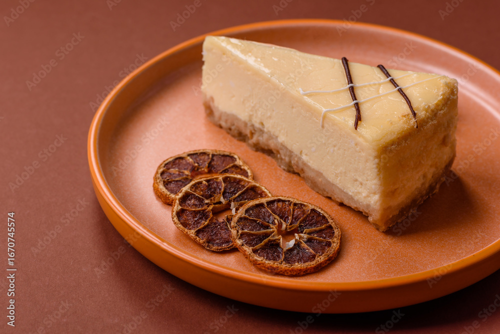 A piece of sweet New York cheesecake, dessert, cheese and vanilla pie. Classic cheesecake