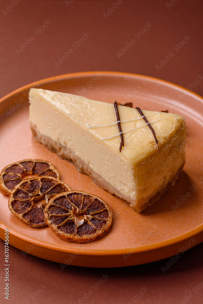 A piece of sweet New York cheesecake, dessert, cheese and vanilla pie. Classic cheesecake