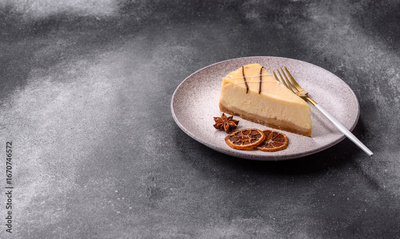 A piece of sweet New York cheesecake, dessert, cheese and vanilla pie. Classic cheesecake
