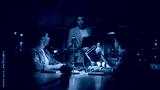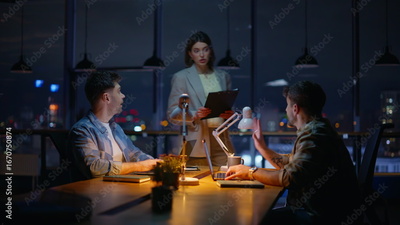 Late woman mentor entering office consulting colleagues discussing at workplace