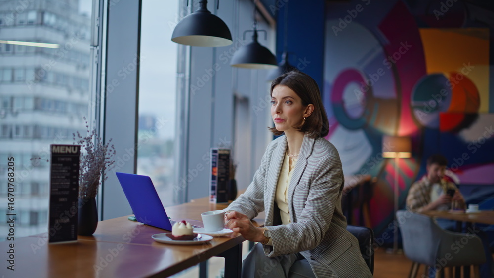 Confident businesswoman working laptop cafe closeup. Woman drinking cappuccino