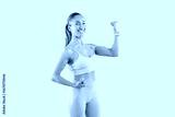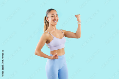 Athletic young woman on blue background shows biceps, close-up. Portrait of trainer girl in sportswear. Concept sports person, physical exercise, portrait sportswoman, bodybuilding