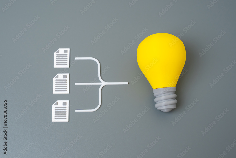 The documents come down to a new idea. Collect information, generate solutions, business analysis, innovation strategy, research process, knowledge leading to creativity