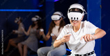 Girls using virtual reality glasses - girlfriends having fun with technology vr headset