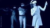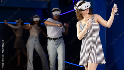 Excited young girl in VR glasses interacting with immersive environment of virtual reality world, standing with controllers in hands and actively gesticulating while controlling objects in game ..