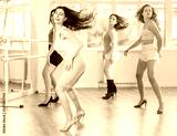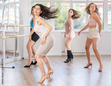 During lesson, girl learn to move beautifully and perform dance in heels with female companion. Slender women rehearse modern dances in concept of pole dance.