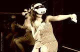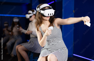 Young woman sitting on stool and enjoying virtual reality game with VR headset and controllers in modern gaming center, fully engaged in immersive experience.