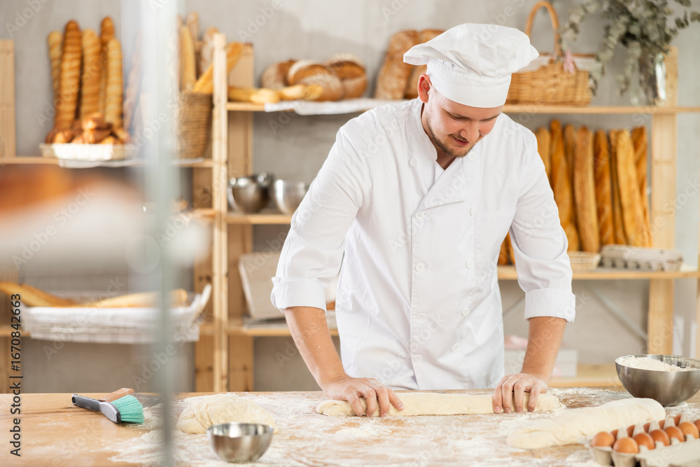 Process of making baguette, loaf or bread in bakery - baker kneads and rolls the dough to give the shape of the future bread