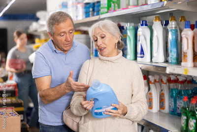Attentive man and woman purchasers choosing liquid detergent out of large stock in a big supermarket