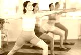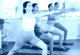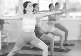 Fit young girl in comfortable sportswear practicing yoga at group session in sunlit airy studio, performing Virabhadrasana, or Warrior Pose..