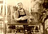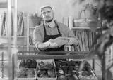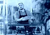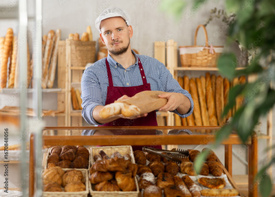 Near counter in bakery, male seller packs baguettes in paper bag, serves customer. Bakery makes and sells fresh flour products