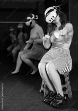 Cheerful emotional young female in VR goggles sitting in virtual reality room with group of friends, manipulating objects or shooting at targets with gaming controllers in hands.
