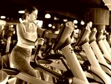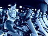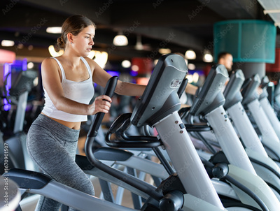 Young woman stands on simulator, performs fitness task using an elliptical simulator. Visitor usefully spends time in fitness club, gets body in good physical shape.