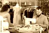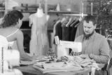 Focused male tailor sewing while young girl draws with curves in fashion studio