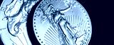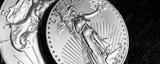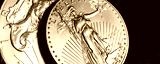 silver eagle and golden american eagle one ounce coins / closeup of silver eagle and golden american eagle one ounce coins on black background