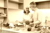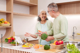 Asian older adult couple happily preparing healthy vegetable salad cooking together modern kitchen home lifestyle nutritious meal wellness