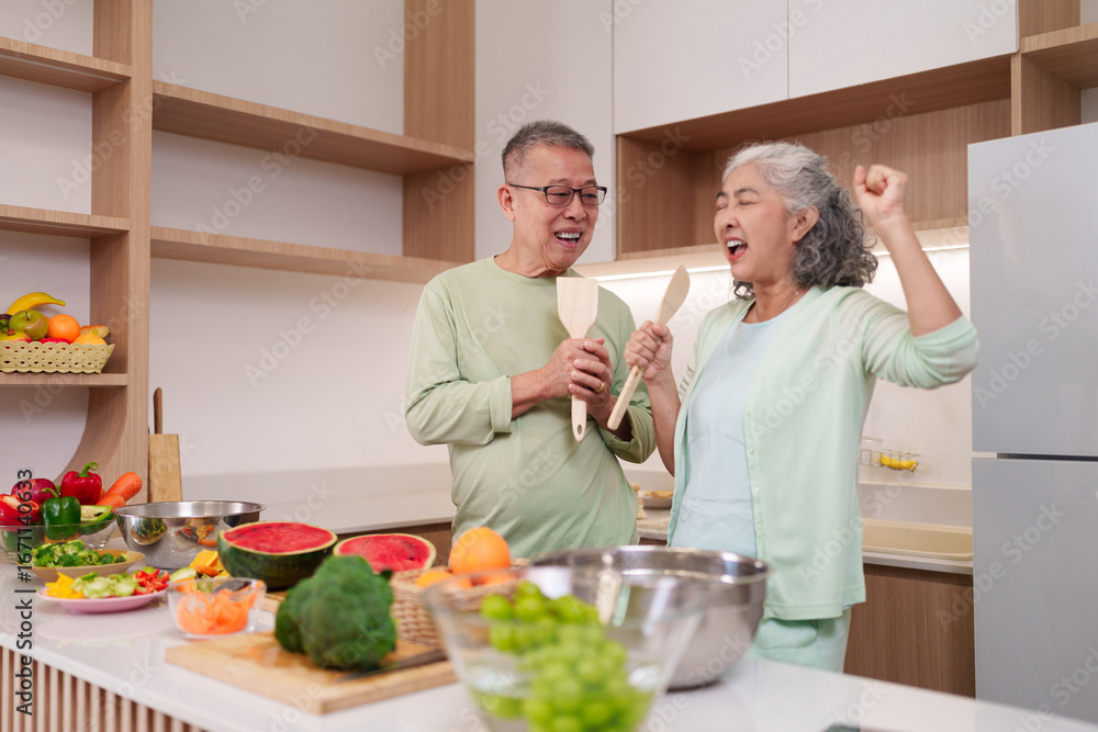 Asian senior couple adults cooking healthy meal joyful laughing singing playing kitchen utensils home modern kitchen preparing fresh food happy retirement lifestyle