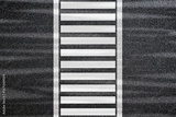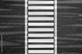 Empty crosswalk on asphalt road with black and white sign on sidewalk curb. top view