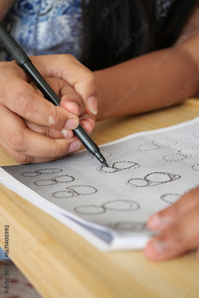 Child practices drawing shapes with a pen on paper
