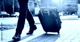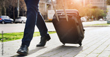 Legs, suitcase and walking with businessman in city for commute, journey or travel to location. Flare, luggage and steps with feet of employee on sidewalk for trip to international destination