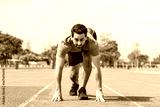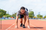 Caucasian young man athlete running exercise on a track at the stadium.