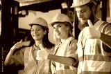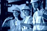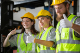 Group of diverse construction workers wearing safety helmets and reflective vests showing thumbs up, representing teamwork, industrial safety and successful collaboration on site.