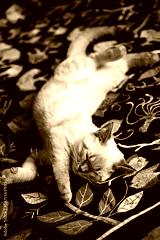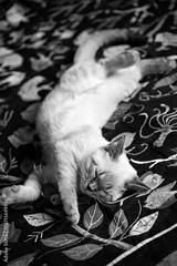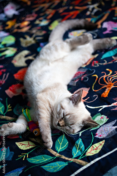 Light-colored cat napping with legs stretched out on a colorful embroidered blanket. Scottish kitten