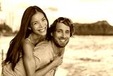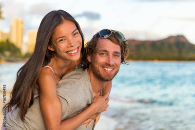 Couple in love on Hawaii travel vacation. Happy Asian woman piggybacking on Caucasian man, multicultural people. Healthy young adults portrait on Waikiki beach, Honolulu, Hawaii.